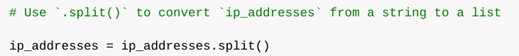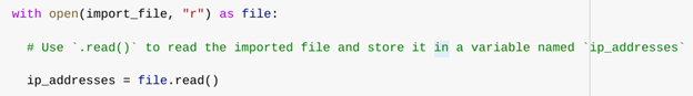 The open() function is used here in read mode ("r") to access the file’s contents. The with statement ensures the file is automatically closed once we finish reading it, helping prevent resource leaks. Within the with block, I used the .read() method to read the full contents of the file and stored it in the variable ip_addresses.