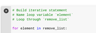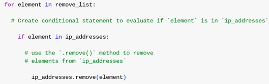 Here, the for loop processes each entry in remove_list. For each element, I first checked if it was present in ip_addresses using a conditional. If it was, I used the .remove() method to delete it. This works efficiently in this scenario since the IP list has no duplicates.