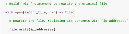 Using "w" tells Python to replace the contents of the file. This ensures that the file now reflects the new state of authorized IP addresses: with all disallowed entries removed.